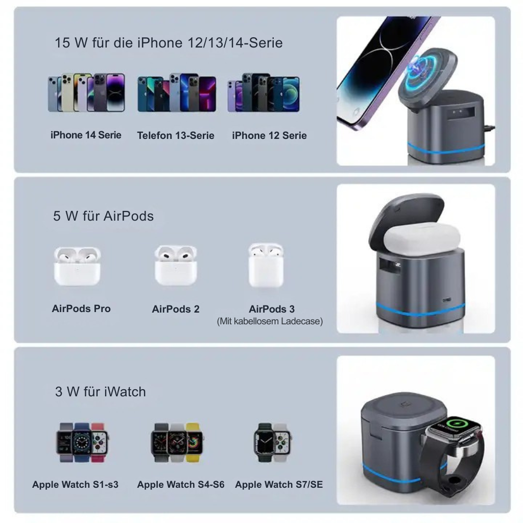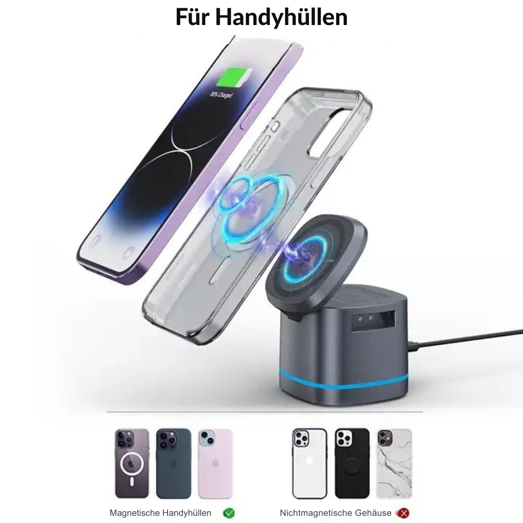 Erleben Sie die Zukunft des Ladens mit unserer 3-in-1 Magnetischen Faltbaren Ladestation und verbessern Sie Ihre tägliche Routine. Bleiben Sie aufgeladen, bleiben Sie organisiert und bleiben Sie mühelos verbunden. Holen Sie sich noch heute Ihre Ladestation für eine intelligentere und übersichtlichere Ladeerfahrung.