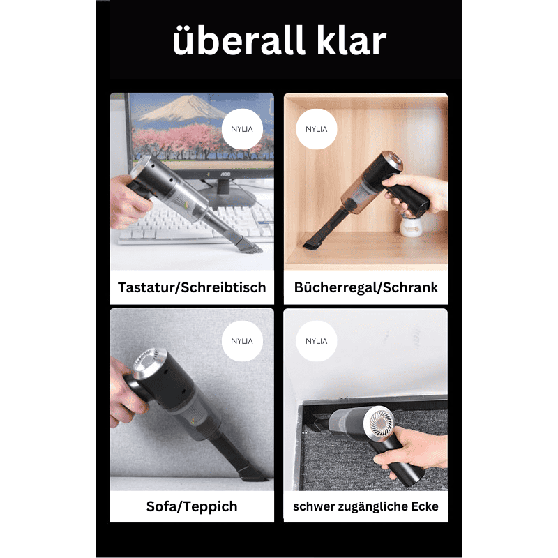• Schnellladung und Reinigung: Unser kabelloser Staubsauger verfügt über die neueste Generation der Schnellladetechnologie und kann in einer Stunde vollständig aufgeladen werden. Der Handstaubsauger mit LED-Licht ist ein toller Helfer für Zuhause, Büro, Tierheim, Auto, Tastatur, Kosmetiktasche, Computer, Schreibtisch, elektronische Geräte usw. Perfekt für die punktuelle Reinigung oder eine einzelne Verschmutzung in einem kleinen Bereich.