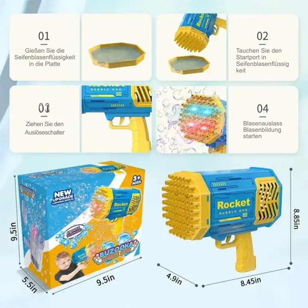 Entdecken Sie die malerischen Landschaften der Schweiz, während Ihre Kinder mit unserem wiederaufladbaren elektrischen 69-Loch-Raketen-Bazooka-Seifenblasenpistolen-Spielzeug ein aufregendes Abenteuer erleben! Perfekt für endlosen Spaß vor der atemberaubenden Kulisse der Schweiz, entfacht dieses innovative Spielzeug die Fantasie und das Outdoor-Spiel Ihrer Kleinen. Erkunden Sie die Schönheit der Schweiz, während Ihre Kleinen mit diesem unterhaltsamen und umweltfreundlichen Spielzeug bunte Seifenblasen erschaffen – eine gelungene Mischung aus Spaß und Nachhaltigkeit. Machen Sie sich bereit für lachende Momente vor der atemberaubenden Schweizer Landschaft mit unserer dynamischen Seifenblasenpistole!